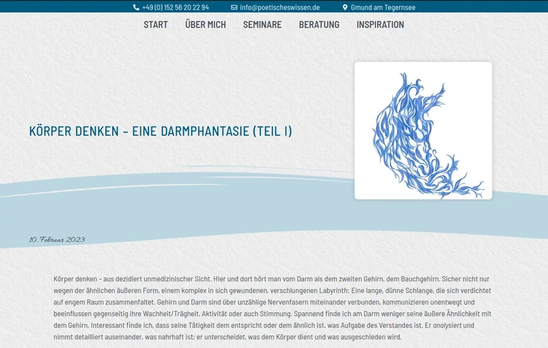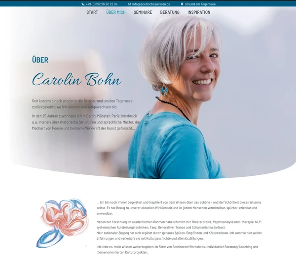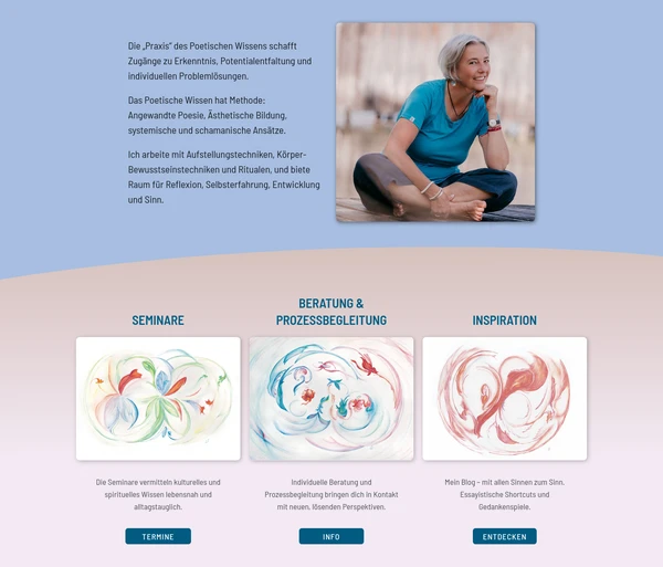 Die promovierte Literaturwissenschaftlerin möchte ihr Coaching-Angebot auf einer ästhetischen Homepage vorstellen, und dabei die Verbindung Ihres Wissens der europäischen Literatur- und Kulturgeschichte mit systemischen und schamanischen Techniken hervorheben. Wichtig sind ihr die zarten Farben, die sich aus ihren liebevoll gezeichneten Aquarellen ergeben.